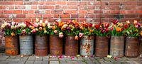 Tulpen, in negen roestige, oude vaten, op een rij voor een oude vervallen bakstenen muur. De tulpen zijn niet vers meer, ze beginnen te verwelken en uit te vallen. Het beeld is met behulp van ai gegenereerd.