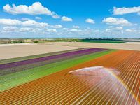 Tulpen in rood en paars groeien op bloembedden in een veld in rijen met een irrigatie waterkanonl dat water over de bloemen sproeit waardoor een regenboog ontstaat in de nevel in Flevoland, Nederland, tijdens de lente van bovenaf gezien op een mooie lentemiddag. Bloemen zijn een van de belangrijkste exportproducten in Nederland en met…