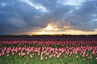 Foto van lente met roze tulpen tijdens zonsopkomst op een bollenveld op Goeree-Overflakkee. De bollenvelden met vele gekleurde bloemen in het voorjaar op Goeree-Overflakkee zijn veel minder bekend dan die van de Bollenstreek, maar misschien wel net zo mooi.