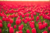Rode tulpen op landbouwgrond in Flevoland, Nederland, in het voorjaar. Flevoland is een provincie van polders in de voormalige Zuiderzee, oorspronkelijk bedoeld om meer land te creëren voor de landbouw.