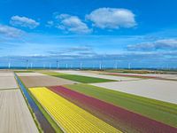 Tulpen op landbouwgronden in de Noordoostpolder in Flevoland, Nederland, in het voorjaar van bovenaf gezien. De Noordoostpolder is een polder in de voormalige Zuiderzee die aanvankelijk bedoeld was om meer land voor de landbouw te creëren.