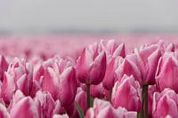 Na een regenbui hangen er nog druppels aan de tulpen. De tulpen zijn roze lila paars met een wit randje. Het tulpenveld ligt er mooi en gezond bij op het eiland Goeree-Overflakkee in de provincie Zuid-Holland in Nederland.