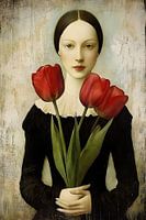Het portretschilderij weerspiegelt de dromerige en surrealistische esthetiek van Catrin Welz-Stein door een vrouw voor te stellen die drie felrode tulpen in haar handen houdt. De compositie is in gedempte pastelkleuren, waardoor het schilderij een zachte maar mysterieuze sfeer heeft.