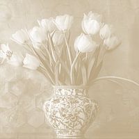 Decoratieve kunstprint van een afbeelding van tulpen in een klassieke vaas, perfect voor muurdecoratie of als behang.