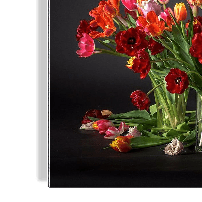 Bij een formaat van 180 cm is de foto net zo groot als het stilleven in werkelijkheid was. Afgedrukt op canvas lijkt het dan een klassiek schilderij. Een 4 cm dikke rand geeft de lijst bij dit formaat dan nog wat meer cachet.