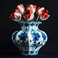 Dit kunstwerk toont een prachtige Delfts blauwe vaas met levendige rood-witte tulpen. De vaas is rijkelijk gedecoreerd met gedetailleerde, blauwe bloemmotieven die de traditionele Nederlandse keramiekkunst belichamen. De felgekleurde tulpen bieden een schitterend contrast tegen het ingetogen blauw-witte patroon van de vaas, waardoor het…