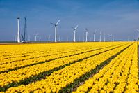 Veld met gele tulpen tijdens de tulpenroute 2016 in de Noordoostpolder. Windmolens op de achtergrond.