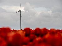 Een rood tulpen veld met een windmolen op de achtergrond.