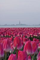 Tulpenveld op een mistige ochtend met op de achtergrond de toren van de Middenbeemster