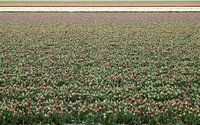 Een tulpenveld vol met rood gele tulpen de knoppen staan op springen, spannend wat de kleuren explosie straks zal zijn. en aan de horizon fraaie kleuren om het beeld compleet te maken.