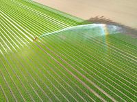 Tulpen groeien in een landbouwveld in rijen met een irrigatie waterkanon dat water over de bloemen sproeit in Flevoland, Nederland, tijdens de lente van bovenaf gezien tijdens een mooie lentemiddag. Bloemen zijn een van de belangrijkste exportproducten in Nederland en met name tulpen en tulpenbollen.