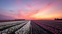Zonsondergang over de tulpenvelden in Flevoland, Nederland.