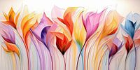 Breng een explosie van levendige kleuren en een moderne, artistieke sfeer in je huis met dit dynamische werk. Het toont een expressieve interpretatie van diverse tulpen.