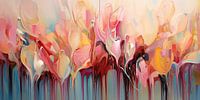 Dit werk toont tulpen in een harmonieuze compositie, waarbij warme tinten centraal staan. De bloemen lijken te zweven op een achtergrond van zachte, neutrale kleuren, wat de levendige tinten van de tulpen nog meer laat stralen. De gedetailleerde penseelstreken geven de bloemblaadjes een bijna tastbare textuur, terwijl de compositie een subtiel gevoel van beweging in zich draagt, alsof de bloemen zachtjes in de wind wiegen. Door de warme uitstraling van dit werk brengt het een gevoel van natuurlijke schoonheid en elegantie in elke ruimte, perfect voor liefhebbers van verfijnde en serene bloemenmotieven.