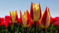 Geel rode tulpen op een rij met op de achtergrond rode tulpen.