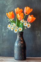Een stralend boeket van feloranje tulpen en delicate madeliefjes geeft elke kamer een vrolijk tintje. De rustieke vaas, met zijn charmante patina, creëert een harmonieuze combinatie van natuur en vintage stijl. Dit arrangement is ideaal voor in de woonkamer en brengt licht en levensvreugde in huis.