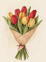 Een iets vollere, klassiekere versie van een tulpenboeket in papier met strik. Zachte kleuren en natuurlijke uitstraling maken dit tot een ideaal werk voor een romantisch of rustiek interieur.