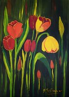 In dit expressieve schilderij bloeien vurige tulpen op tegen een duistere achtergrond, als vurige symbolen van hoop en kracht. De kunstenaar, R. Tielemans (2025), gebruikt een gedurfde kleurencombinatie van rood, geel en groen, waarbij het contrast met het bijna zwarte doek de bloemen als het ware laat oplichten.