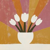 Tulpenlicht is een verstild en krachtig beeld waarin eenvoud, ritme en kleur samenkomen tot een poëtische compositie. Vijf witte tulpen, strak en symmetrisch opgesteld, rijzen op uit een ronde, witte vaas. De bloemen zijn stilistisch en gestileerd weergegeven — zonder details of schaduwwerking — wat ze haast iconisch maakt. Deze reductie tot de essentie geeft de voorstelling een tijdloze, universele uitstraling.