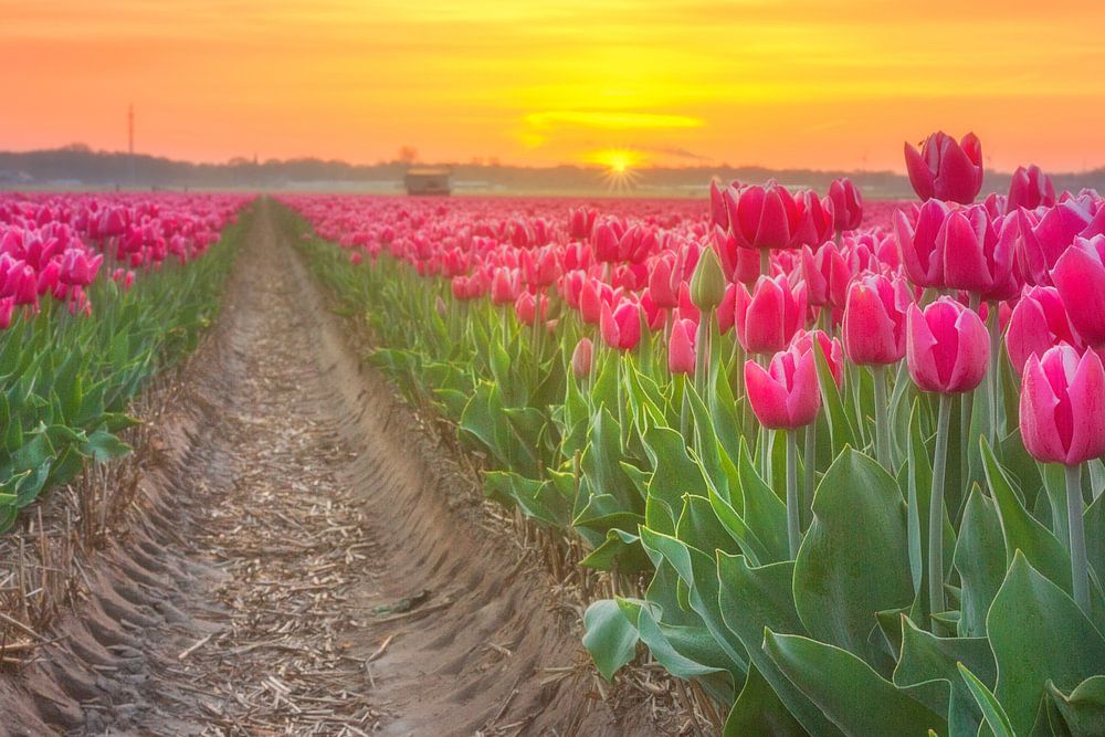 Tulpenveld tijdens zonopkomst bij Egmond-Binnen