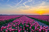Een prachtige foto van een ondergaande zon bij een tulpenveld waarbij de tulpen vol in bloei staan.