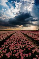 Tulpenveld in de Flevopolder met een regenbui op komst.
