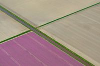 Tulpenveld met paarse tulpen en een kruisvorm van sloten in de Noordoostpolder vanuit de lucht gezien. In Flevoland groeien ieder voorjaar verschillende soorten tulpen op de akkers, waardoor een abstract lijnenspel ontstaat in het door mensen gecreëerde landschap.
