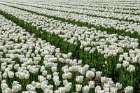 Veld met witte tulpen. Voorjaarsopname. Schuine diagonale lijnen.