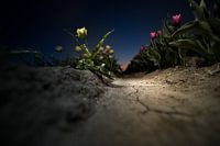 Uitgedroogd akkerveld met gescheurde aarde en bloeiende tulpen. Laatste zonlicht aan het einde van de horizon die een beetje hoop geeft op regen door de lucht te kleuren met avondrood.