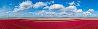 Rode tulpen groeien in de lente op landbouwvelden in Flevoland, Nederland, van bovenaf gezien. De Flevopolder is een polder in de voormalige Zuiderzee, in eerste instantie ontworpen om meer land te creëren voor de landbouw en is een van de grootste bloembollenteeltgebieden in Nederland.