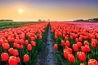 Prachtige landschaps opname van oranje rode en roze tulpen in een veld in de flevopolder in Nederland in de lente tijdens zonsondergang