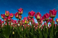 Deze tulpen uit een bollenveld in Flevoland heb ik gefotografeerd vanuit een laag standpunt. Hierdoor krijg je de lucht als achtergrond, die mooi contrasteert met de roze tulpen. Een fleurige voorjaarsfoto voor aan de muur.