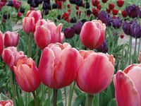 Tulpenveld met roze, paarse en rode tulpen in het voorjaar.