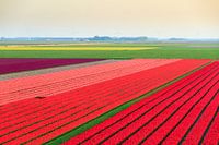 Prachtige landschaps opname van gekleurde tulpen bollenvelden in een veld in de flevopolder in Nederland in de lente tijdens zonsondergang, gezien vanuit een verhoogd perspectief
