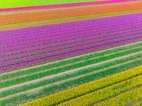 Tulpen in landbouwvelden in de Noordoostpolder in Flevoland, Nederland, in het voorjaar van bovenaf gezien. De Noordoostpolder is een polder in de voormalige Zuiderzee, oorspronkelijk bedoeld om meer land voor de landbouw te creëren.