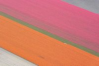 Tulpenvelden met oranje en roze tulpen in de Noordoostpolder vanuit de lucht gezien. In Flevoland groeien ieder voorjaar verschillende soorten tulpen op de akkers, waardoor een abstract lijnenspel ontstaat in het door mensen gecreëerde landschap.