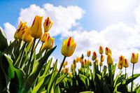Een typisch Hollands fenomeen. De tulpenvelden met daarboven de oerhollandse lucht. Schaapjeswolken en verder blauw.