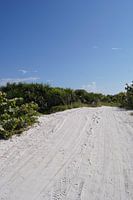 Helemaal alleen de strand op gaan. Het prachtig witte zandpad kan alleen een voorbode zijn van wat er achter de begroeiing ligt.