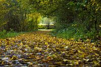 Herfst in Nederland, de bladeren kleuren geel en bruin en vallen uiteindelijk van de bomen. Dit wandelpad in recreatiegebied Geestmerambacht is omgetoverd in een tunnel van bomen en bladeren. Aan het einde van deze tunnel brandt het licht.