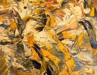 Met spatel ruw opgebrachte acrylverf. Kleuren mengen voorzichtig. De kleuren zwart, donker en licht geel vormen een kleurrijke combi.