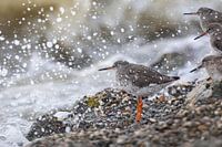 Een tureluur staat op een hoogwatervluchtplaats in de Waddenzee tijdens vloed en krijgt door de golven en harde wind een douche. Andere tureluurs kijken toe
