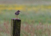 Een foto van een tureluur op een paaltje in de regen. Deze vogel staat helaas op de rode lijst en wordt bedreigd.
