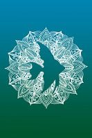een decoratief kunstwerk van een cirkelvormige mandala met het silhouet van een vis precies in het midden tegen een turquoise achtergrond.