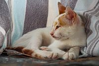 Een van de vele straatkatten die bij het hotel op de stoelen rond het zwembad kwam liggen om te genieten van de zachte bedjes en de aandacht.