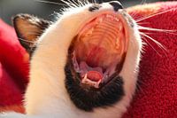 Een van de vele straatkatten die bij het hotel op de stoelen rond het zwembad kwam liggen om te genieten van de zachte bedjes en de aandacht. Gapend en genietend van het zonnetje.