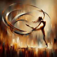 Dit olieverfwerk toont de sierlijke bewegingen van een turnster met een lint, in een palet van beige, bruin en goud. De vloeiende lijnen van het lint dansen om haar heen en versterken de dynamiek en elegantie van haar pose. De verfijnde kleuren benadrukken de kracht en gratie van haar figuur, terwijl de gouden tinten een subtiele glans toevoegen.