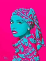 Dit digitale kunstwerk van kunstenaar René van den Berg is een krachtige, eigentijdse interpretatie van het meisje met de parel. Het klassieke profiel en de iconische pareloorbel blijven herkenbaar, maar worden radicaal vernieuwd door het gebruik van felle, contrasterende kleuren. Het gezicht is uitgevoerd in een intens turquoise, dat…