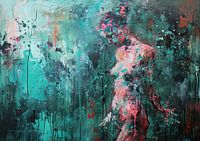 Turquoise Abstractie - Het doek toont een figuur, vermoedelijk vrouwelijk, versmolten met een achtergrond van intense turquoise en diepgroene tinten, geaccentueerd door impulsieve spatten van roze en rood. Deze abstracte representatie flirt met de grenzen van figuur en achtergrond, waarbij texturen en kleuroverlopen een dynamisch spel spelen, wat bijdraagt aan de levendigheid en ruwe emotionele energie van het werk.