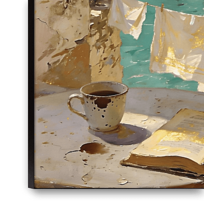 Een zonovergoten balkon kijkt uit op een rustige turquoise baai en vangt een sereen moment van mediterrane ontspanning. Een kleine houten boot met een enkel zeil drijft zachtjes op het kalme water, weerkaatst het gouden zonlicht en versterkt de vredige sfeer. Wasgoed wappert lichtjes aan een lijn, gedragen door een warme, zachte bries,…