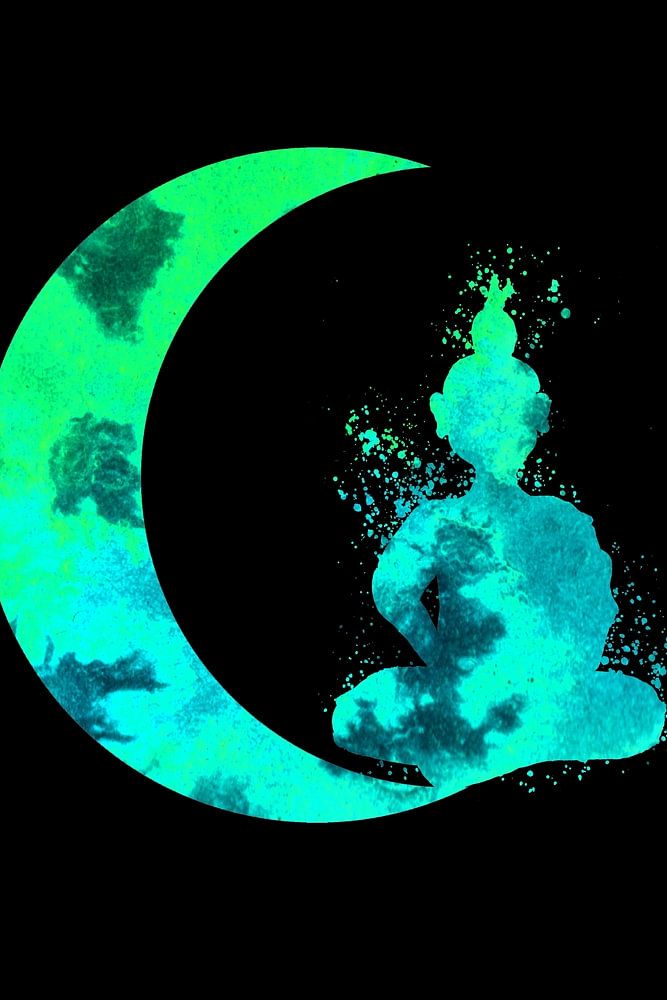 decoratief kunstwerk van het silhouet van een halve maan met op de rand een mediterende boeddha in surrealistische turquoise kleuren.